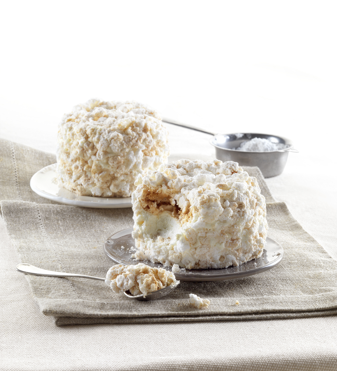 Halbgefrorenes Dessert aus einer Creme mit Vanillegeschmack ( 63,5%), umhüllt mit Baiser,dekoriert mit Puderzucker